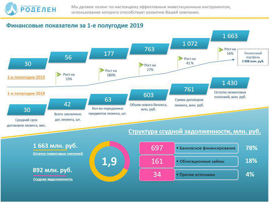 1️. Органический рост. Остаток лизинговых платежей за год вырос на 16%. В среднем по рынку, да и среди облигационных эмитентов рост был выше. Но в контексте качества заемщика — лчше более спокойный прирост. Рынок лизинга — в тренде бурного развития. Которое в случае изменения денежной или законодательной обстановки может обернуться серьезными разочарованиями. Консерватизм Роделена радует.