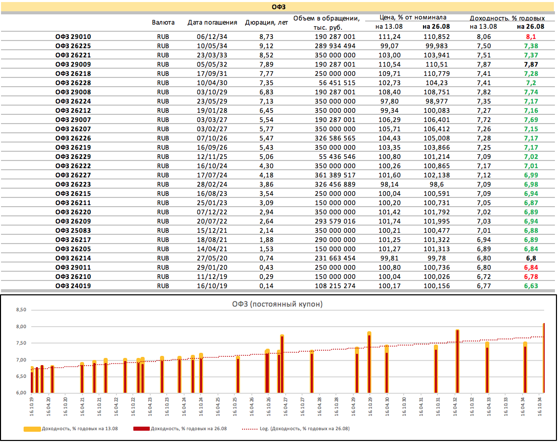 Доходности казначейских облигаций повторили движение вниз, начатое западных рынках госдолга. Реакция на глобальные тенденции? Возможно и так, но и на нашем рынке достаточно сильны ожидания снижения ставок. Кривая доходностей стала немного более пологой, причем на всей ее протяженности: спред между “долгими” и “короткими” выпусками уменьшился, а бумаги среднего сегмента сконцентрировались на уровне семипроцентной доходности. Стоит ли проводить аналогии и готовиться к проблемам на фондовом рынке страны? Считаем, что это преждевременно: данные конца лета не самые показательные для составления прогнозов, а более четкая картина сложится в первой половине сентября.