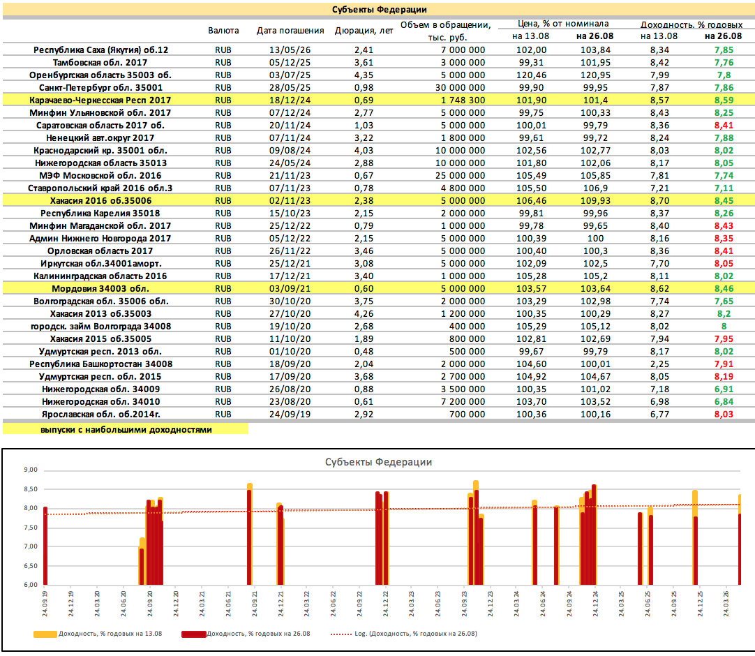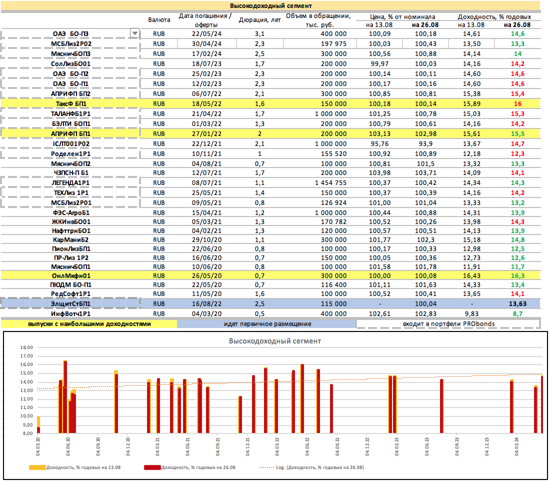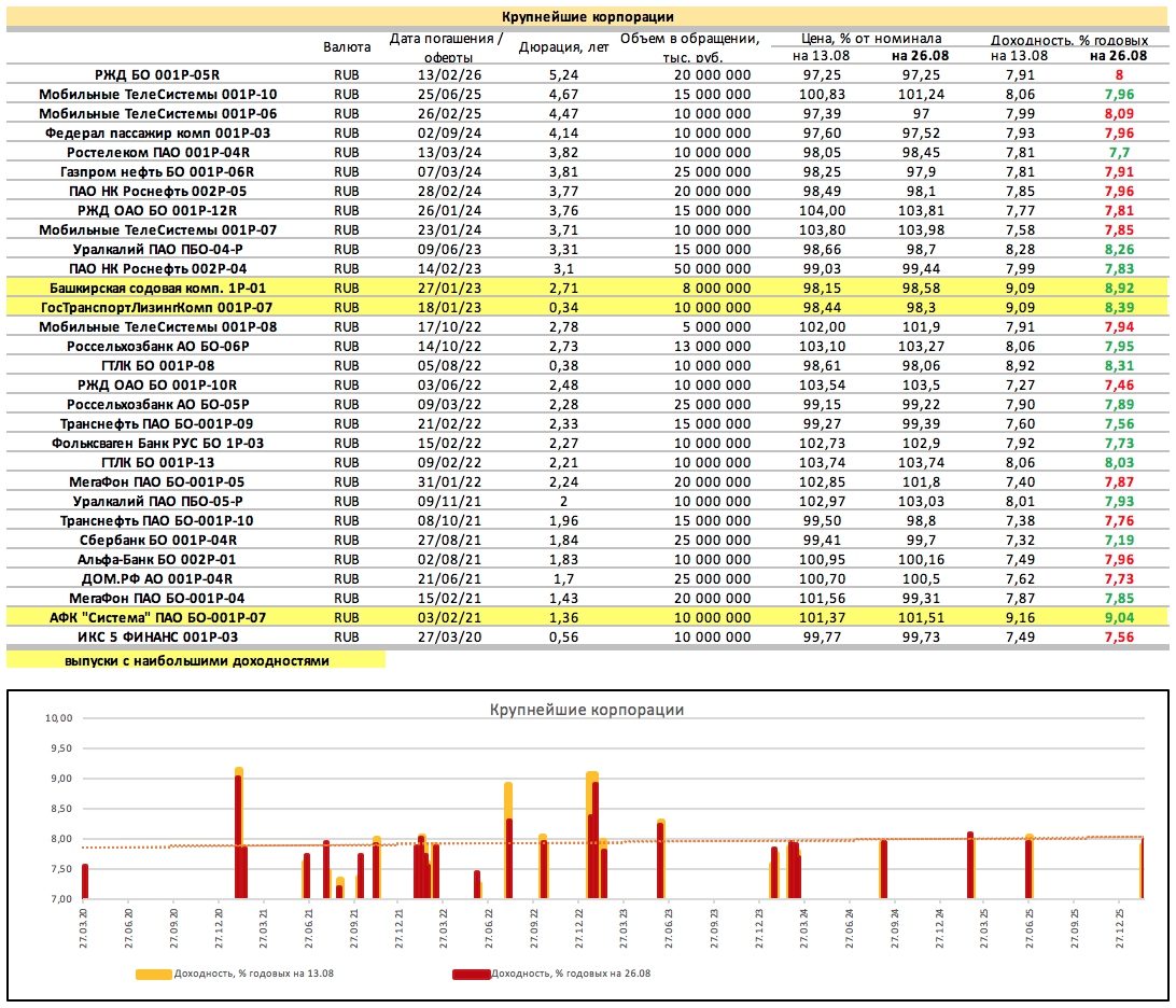 Лидеры по доходности остались все те же (Система, ГТЛК и Башсода), но в течение второй половины августа их доходности претерпели наиболее серьезные изменения среди всей выборки. Это напоминает нам о том, что крупные корпоративные эмитенты включают в себя как и внутренние риски самой компании, так и весь спектр рисков долгового рынка. Звучит устрашающе, но при высоком доверии к эмитенту первый риск постепенно нивелируется. Кому верить, а кому нет — решать вам как инвесторам.
