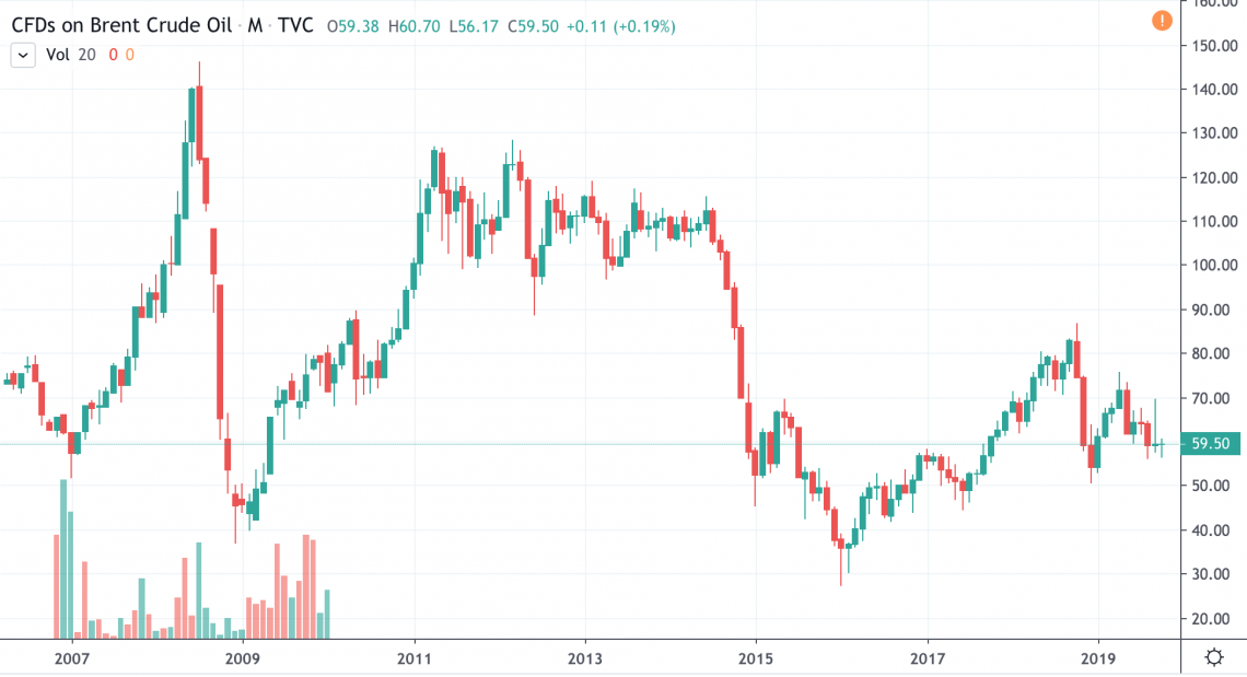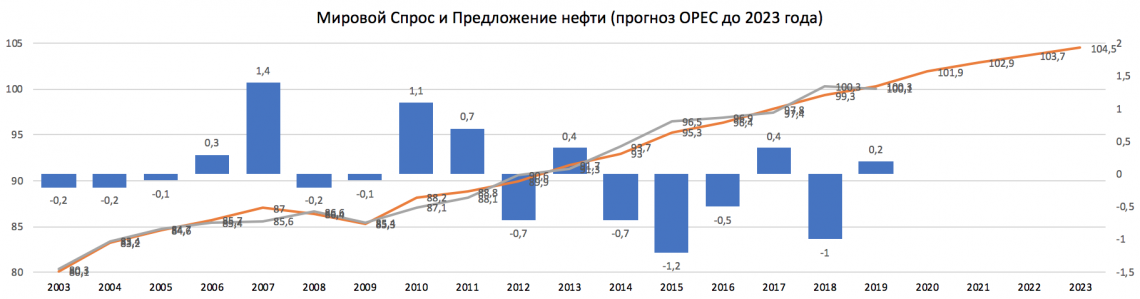 В 2007 году, мы видим превышение спроса над предложением, а на следующий год - рост цены на нефть до знаменитых $140. В 2013 и 2018, когда по итогам года сложилась обратная ситуация, и нефть стала дешеветь до уровня $30 в 2014 и $45 в 2016 годах соответственно.