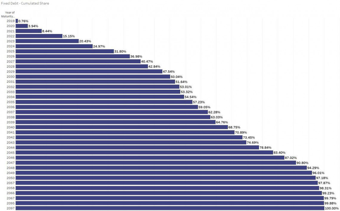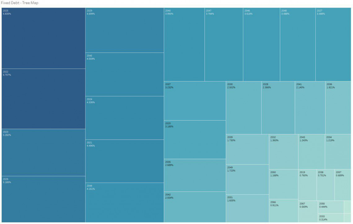 Ниже пара схем показывающих какие долги на какой срок. Тут участвует только долги с фикс ставкой, коих большинство. Долгов с плавающей ставкой меньше