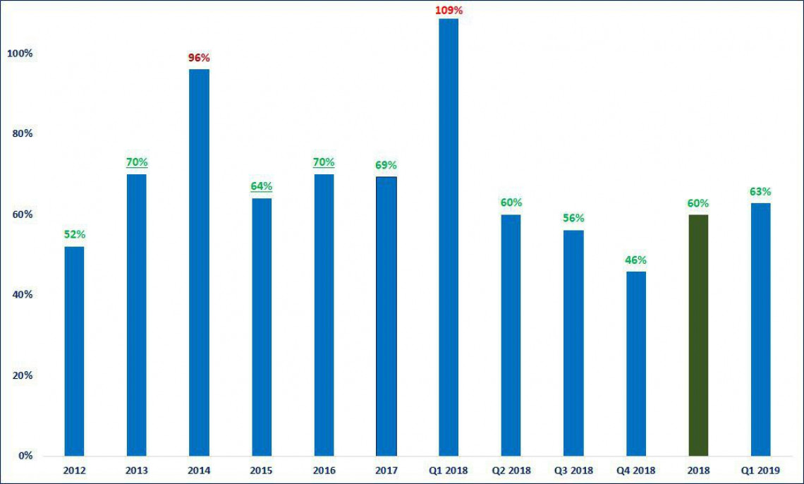 То лишь изредка платежи по дивидендам превышали прибыль. На текущий момент на дивиденды тратится 63% от прибыли а остальное идет на погашение долга
