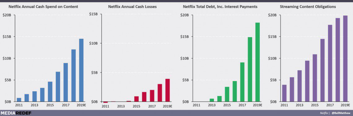 Если говорить про чужой контент, то тут все просто, она выплачивает оговоренные суммы время от времени. Вообще сумма которую она должна выплатить в ближайшие годы по соглашениям с другими правообладателями составляет чуть больше 20 млрд долларов.