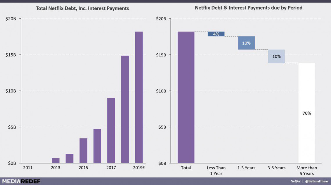 Ситуация с денежным потоком, скорее всего выведет Нетфликс на новый займ уже в конце 2019 года тем самым увеличив его долг еще больше. Вместе с величиной долга растут и платежи по процентам